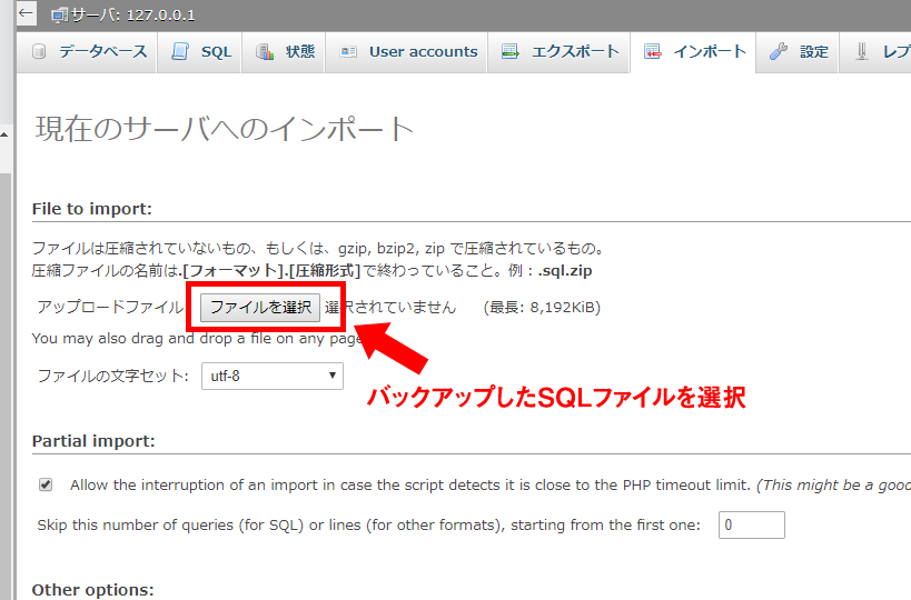 「現在のサーバへのインポート」のページが表示されます。「File to import」で先ほどバックアップしたSQLファイルを選択します。