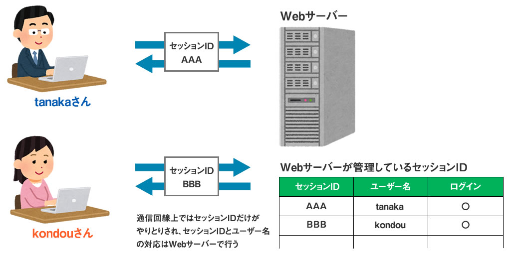 クライアントは、サーバーとの間で「セッションID」を使ってリクエストとレスポンスをやり取りします。そしてサーバーは「セッションID」と「ユーザーの識別情報」の対応関係を「セッション」として保存します。
