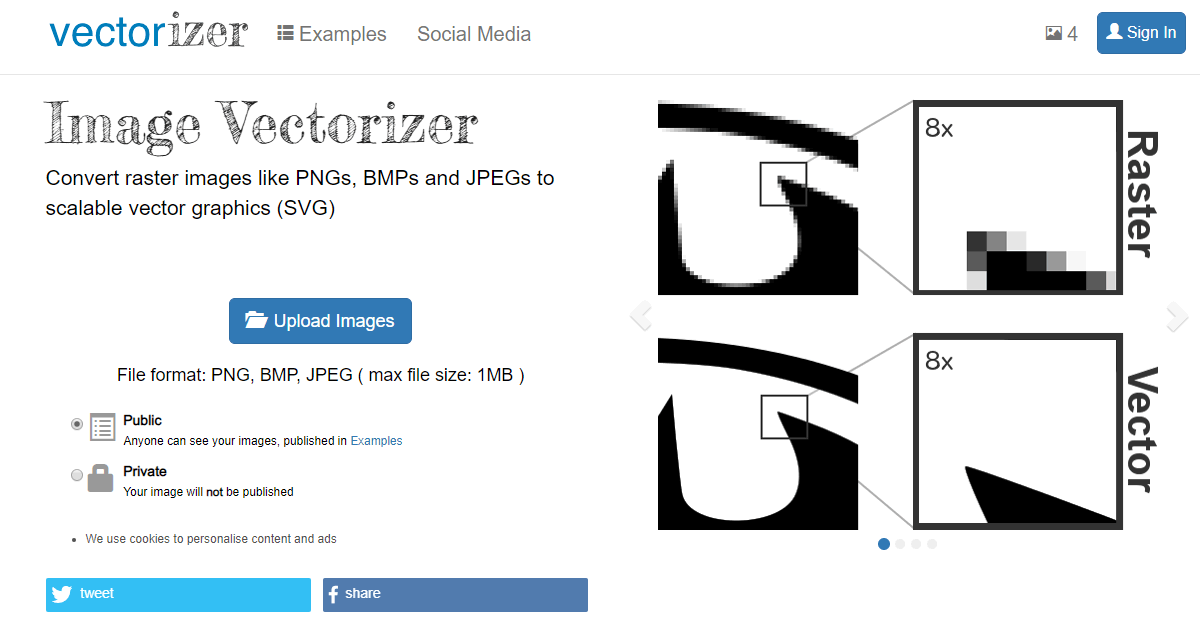 PNG、BMP、JPG形式の画像ファイルを、SVG画像に変換してくれるサービスです。1つの画像ファイルの容量が1MB以下という制限があります。
