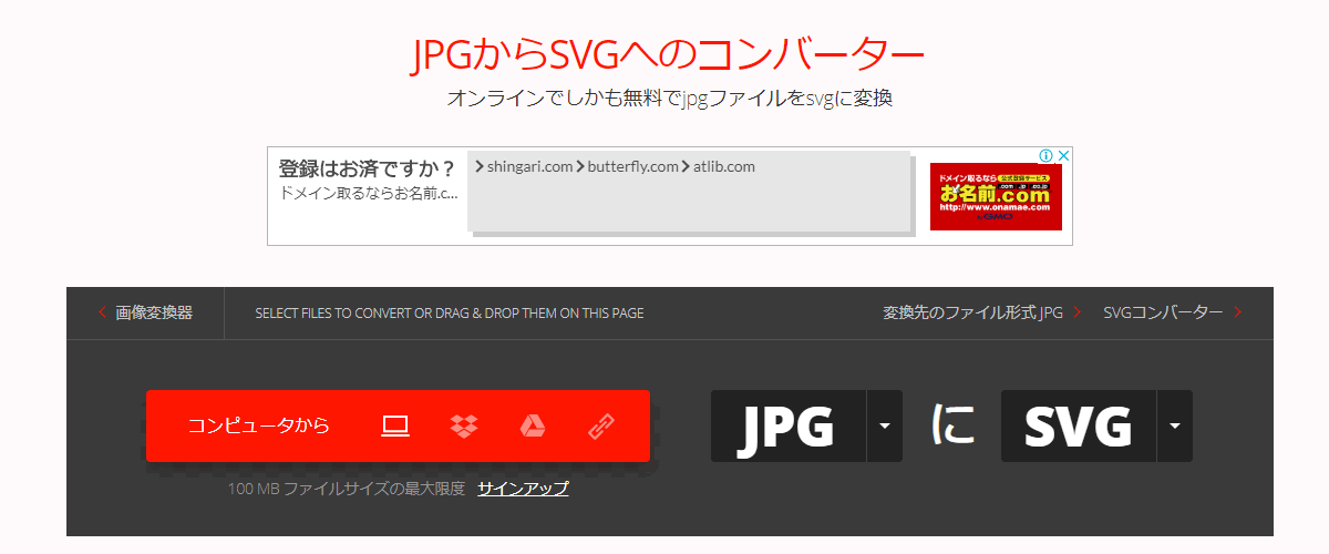 タイトルが「JPGからSVGへのコンバーター」となっていますが、実はいろいろな画像フォーマットのファイルを、別の画像フォーマットへと変換できるWebサービスです。