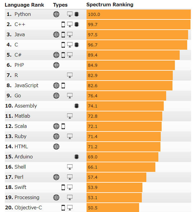 現在はどのようなプログラミング言語が人気なのかを調査をしたIEEE Specturmによる「Top Programming Languages 2018」のデータを紹介します。
