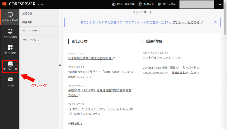 コントロールパネルの左サイドバーに「データベース」と書かれたアイコンがあるので、クリックします。