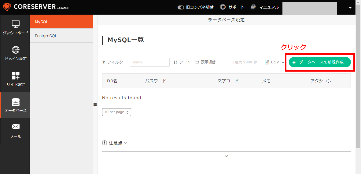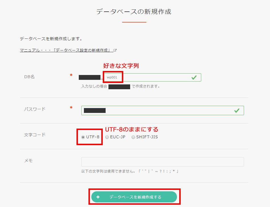 データベースの設定が完了したら、「データベースを新規作成する」ボタンをクリックしましょう。