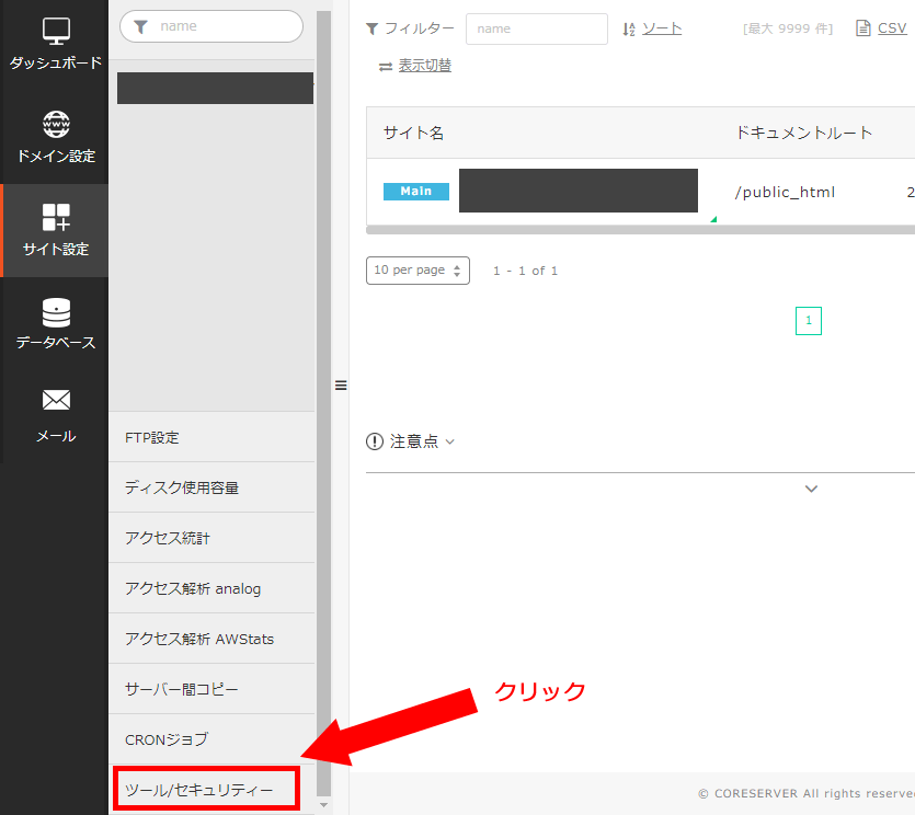 左サイドバーの一つ右の列にある「ツール/セキュリティ」をクリックします。