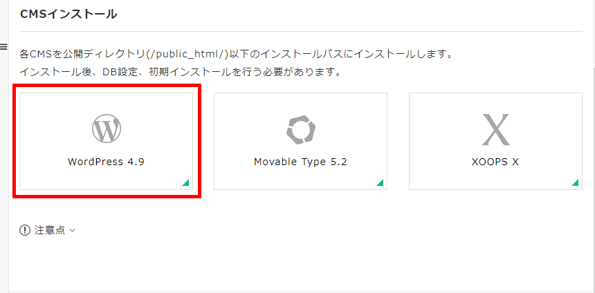 「WordPress 4.9」「Movable Type 5.2」「XOOPS X」と3つのCMSが表示されていますが、ここでは「WordPress 4.9」のボタンをクリックします(当記事閲覧時点で、バージョンは変わっているかもしれません)。