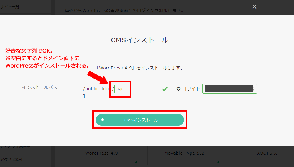 画面を下にスクロールすると、「CMSインストール」という見出しが表示されます。