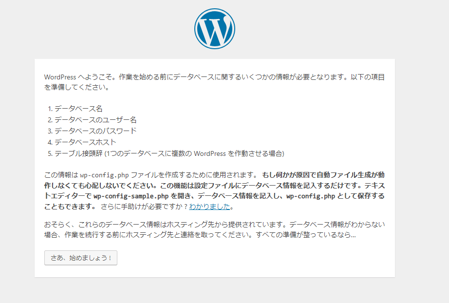 「WordPressへようこそ」の画面が表示されますので、「さぁ、始めましょう!」ボタンをクリックします。