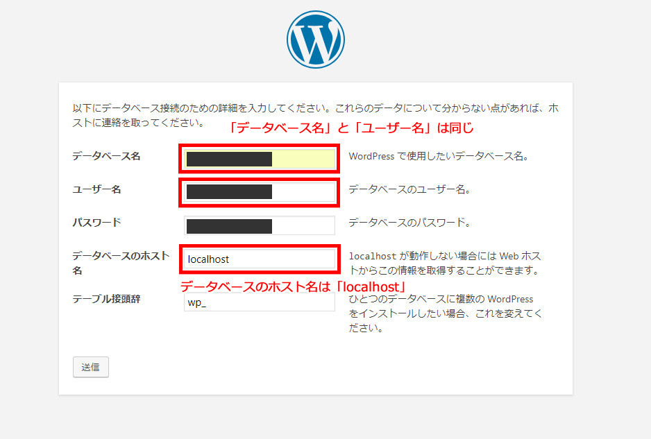 WordPressに、先ほど作ったデータベースの設定を適用させます。