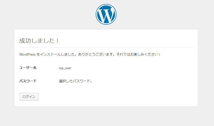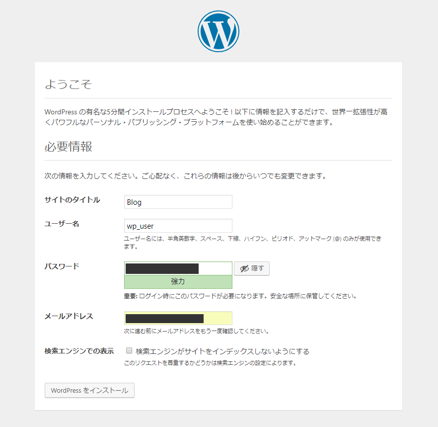 引き続きWordPressのログイン情報を入力します。すべての情報が入力できたら「WordPressをインストール」ボタンをクリックします。
