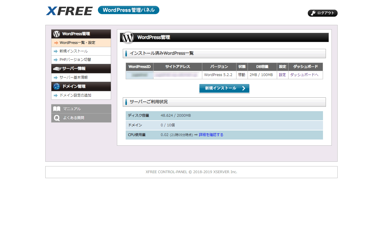XFreeでは、WordPressの新規インストールが5つまで行えます。自動インストール機能に対応しており、必要なデータベースも自動的に作成してくれます。