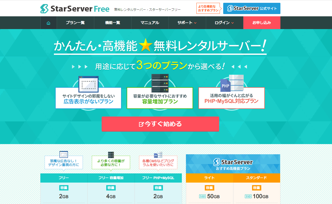 最後に紹介するのは、Star Server Freeです。先ほど紹介した2社の比べると、可もなく不可もなくといったあまり特徴のないサーバーですが、無料でWordPressを動作させられるレンタルサーバーです。