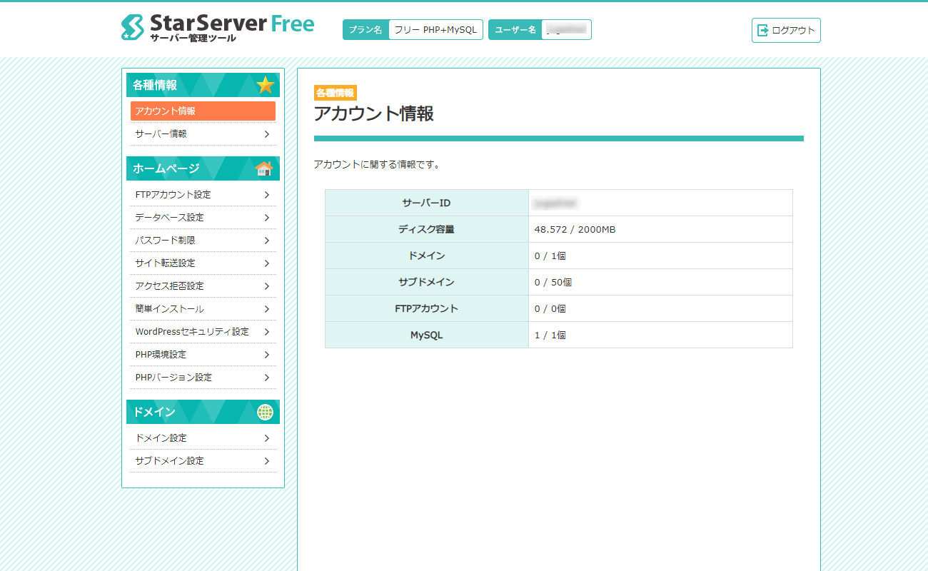 上の画像は、Star Server Freeの管理画面です。直感的で使いやすい管理画面だと感じました。