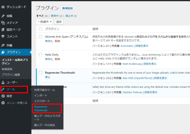 有効化したら、「ツール」から「Regenerate Thumbnails」のメニューをクリックしましょう。