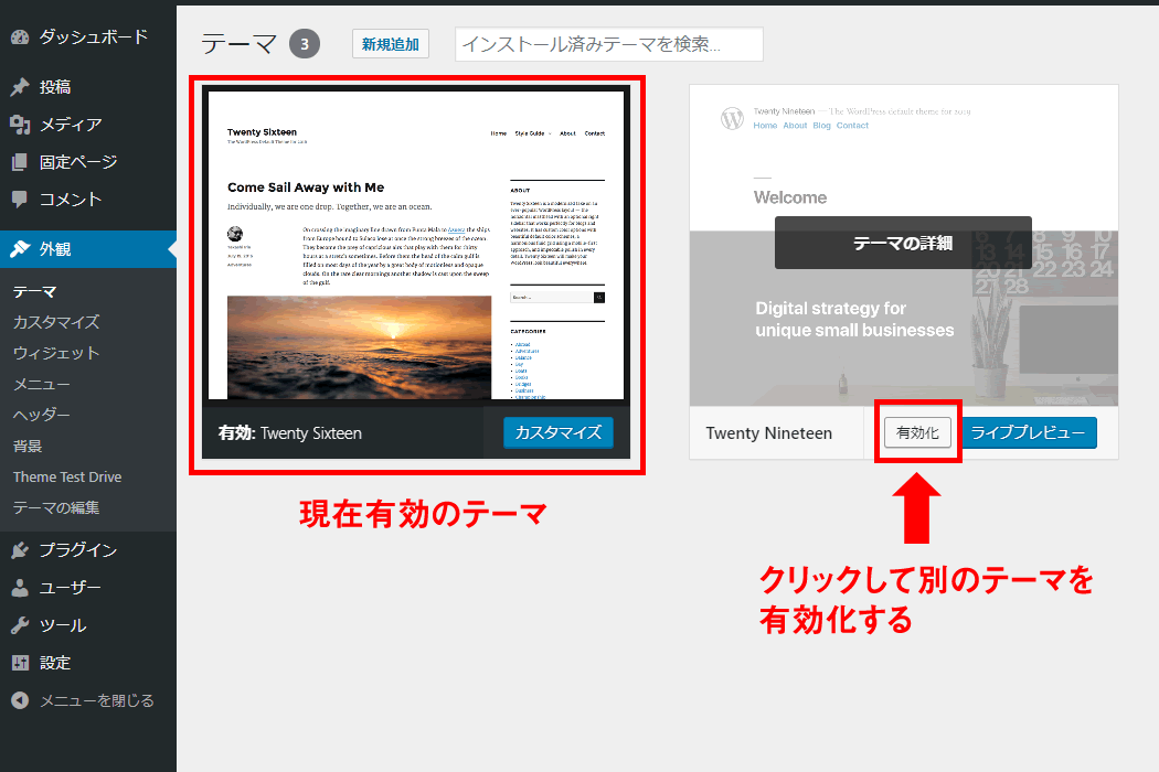 複数のテーマをインストールできますが、実際に有効化できるテーマは1つだけです。