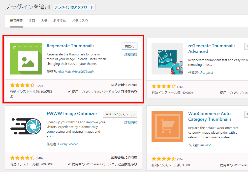 プラグインの追加から、「Regenerate Thumbnails」を検索してインストールします。インストールが完了したら有効化しましょう。