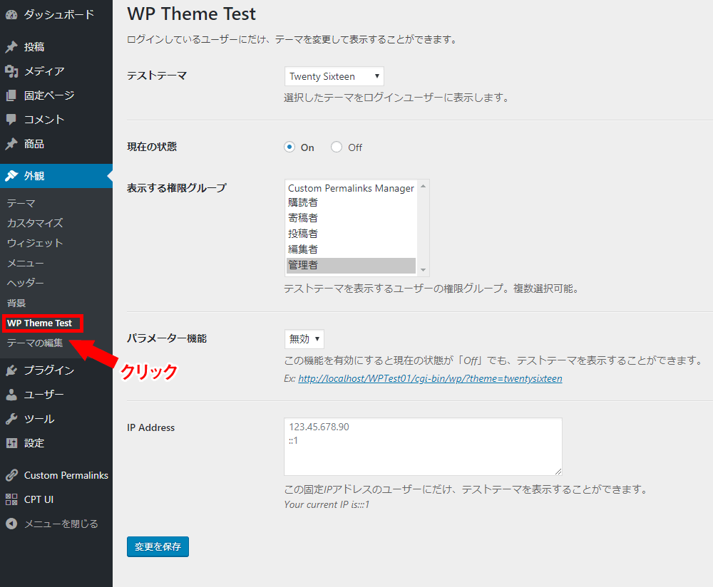 有効化したら、プラグインの設定画面を開きましょう。管理画面のメニュー「外観」から「WP Theme Test」メニューをクリックします。