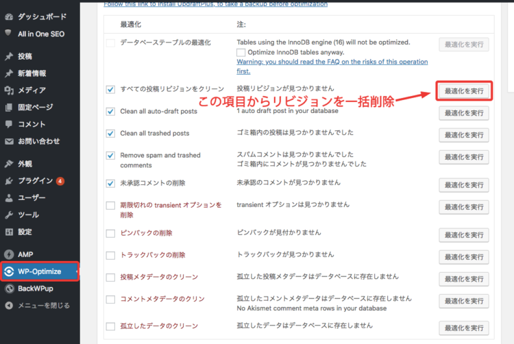 3. 「すべての投稿リビジョンをクリーン」の「最適化を実行」を押すとリビジョンがすべて削除される