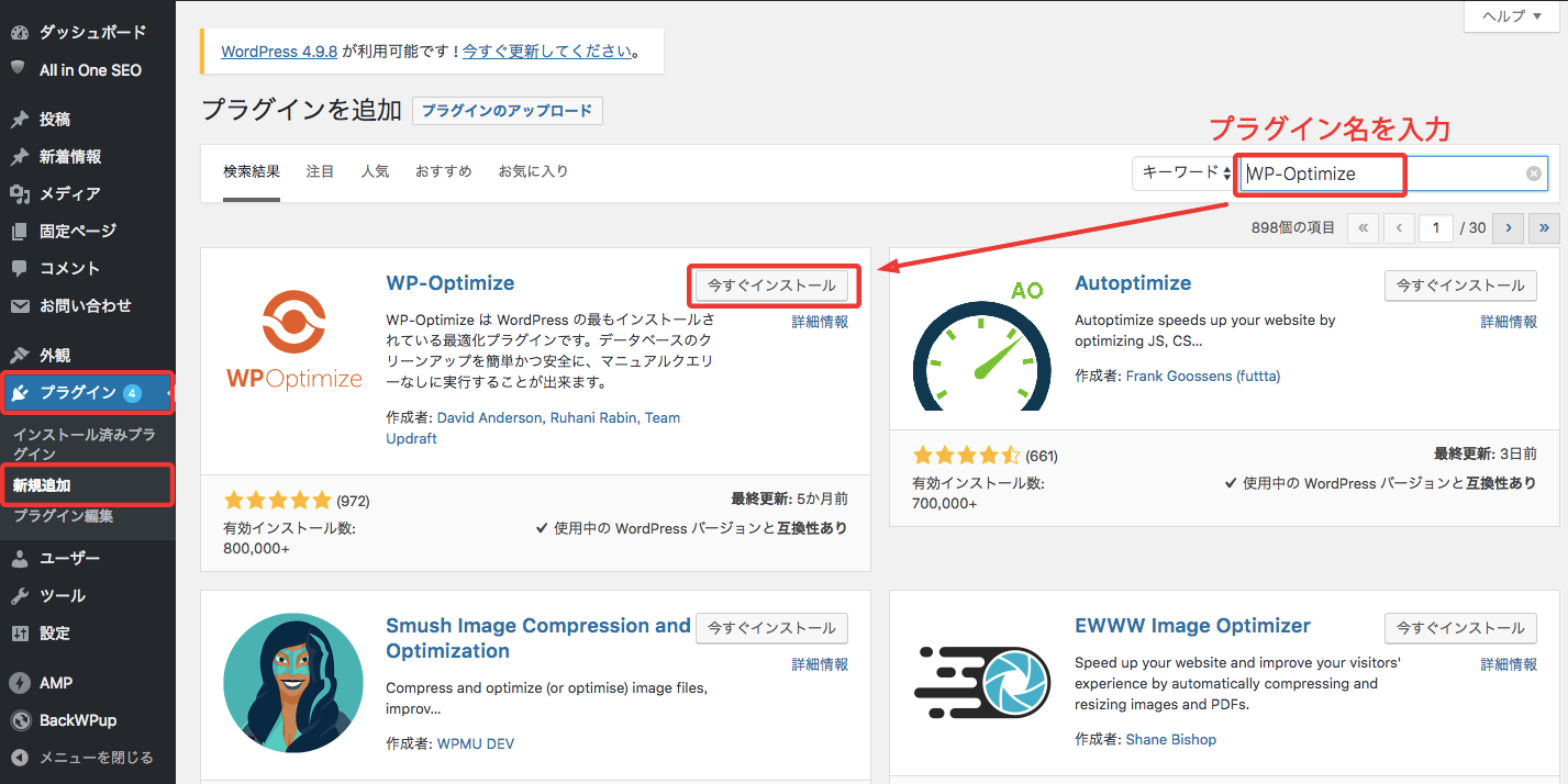 1. 管理画面からプラグイン「WP-Optimize」をインストールして最適化