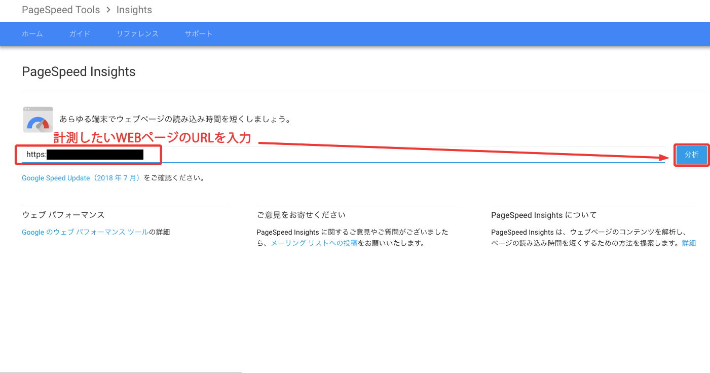ページの表示速度を判断するには、PageSpeed Insightsのサイトにいき、ページのURLを入力して「分析」ボタンを押すだけで簡単に計測することができます。