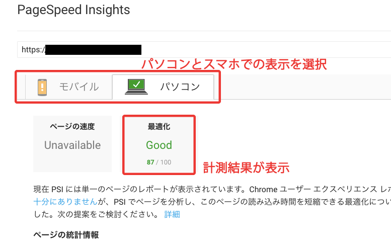 結果は、「パソコン」とスマホなどの「モバイル」両方の表示速度を診断することが可能です。