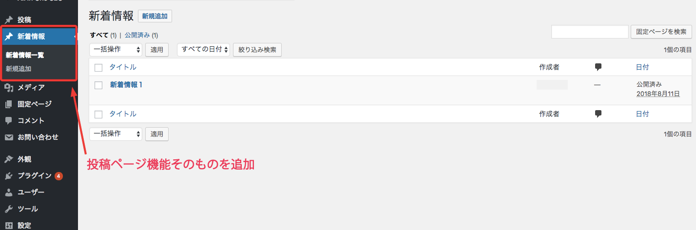 通常の記事投稿ページとは別に、新たに投稿ページを作成します。今回の場合だと、新着情報というテーマで新たに投稿ページを作成しました。