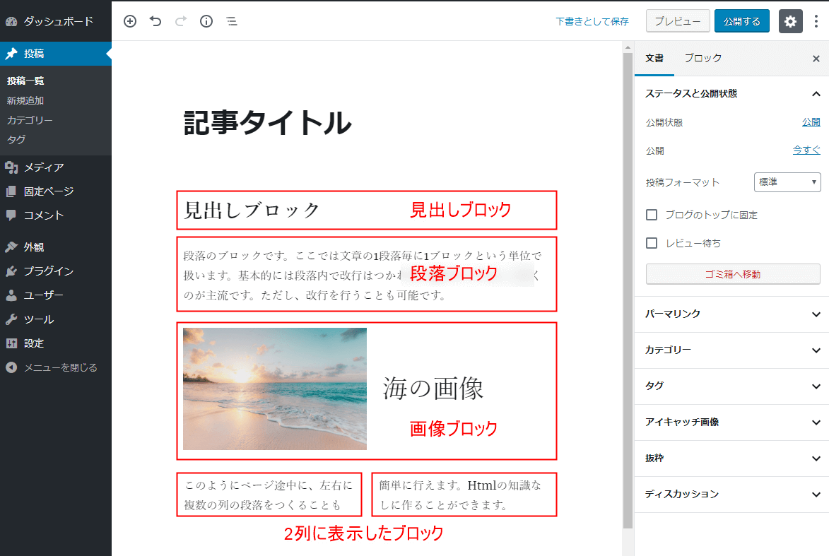 • Gutenbergエディターではブロック単位で記事を作成する。