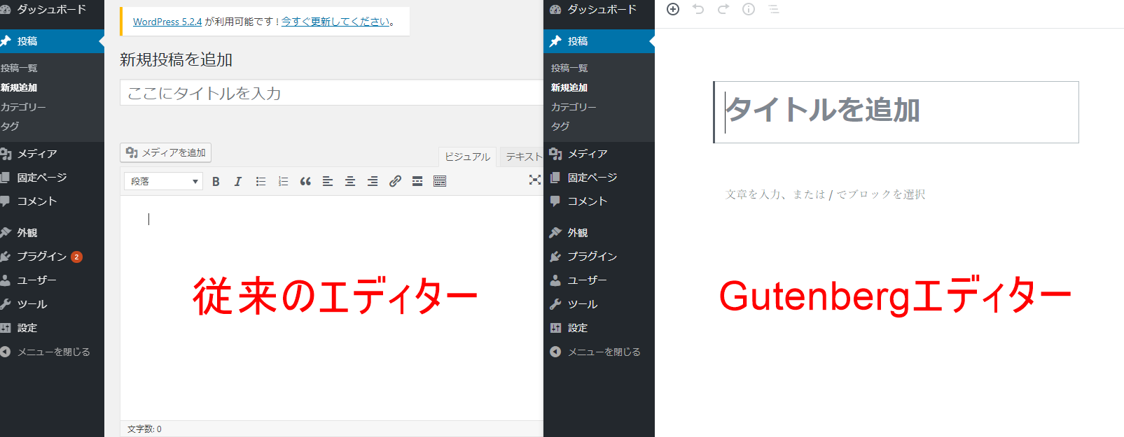 上図の左のような「従来のエディター」が表示される場合には、WordPressのバージョンが5以前のため、アップデートすることでGutenbergを使うことができます。