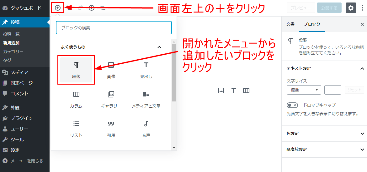 ブロックを追加するには、編集画面左上にある+ボタンをクリックします。