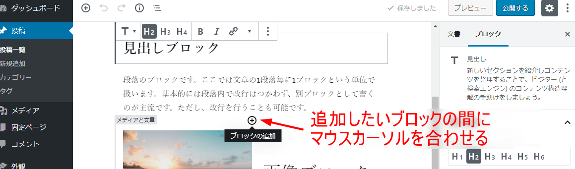 ブロックとブロックの間にマウスカーソルを合わせると+ボタンが表示されるので、ブロックを追加することができます。