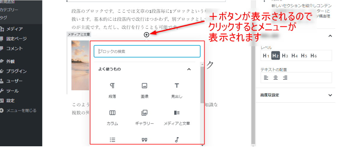 追加したい箇所にマウスカーソルを合わせると、+ボタンが表示されます。その+ボタンをクリックするとブロックのメニューが表示されるので使いたいブロックを選んでください。