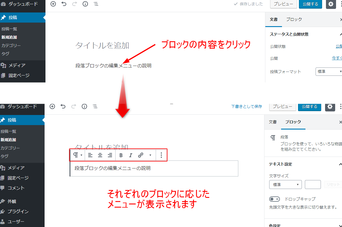 ブロックごとに表示されるメニューは異なりますが、それぞれに適したメニューが表示されます。