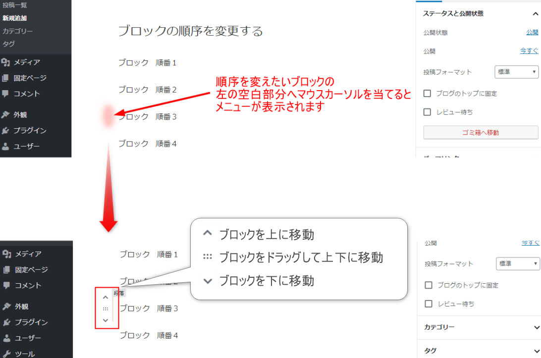 Gutenbergでは、ブロックごと、簡単に順序の入れ替えをすることができます。