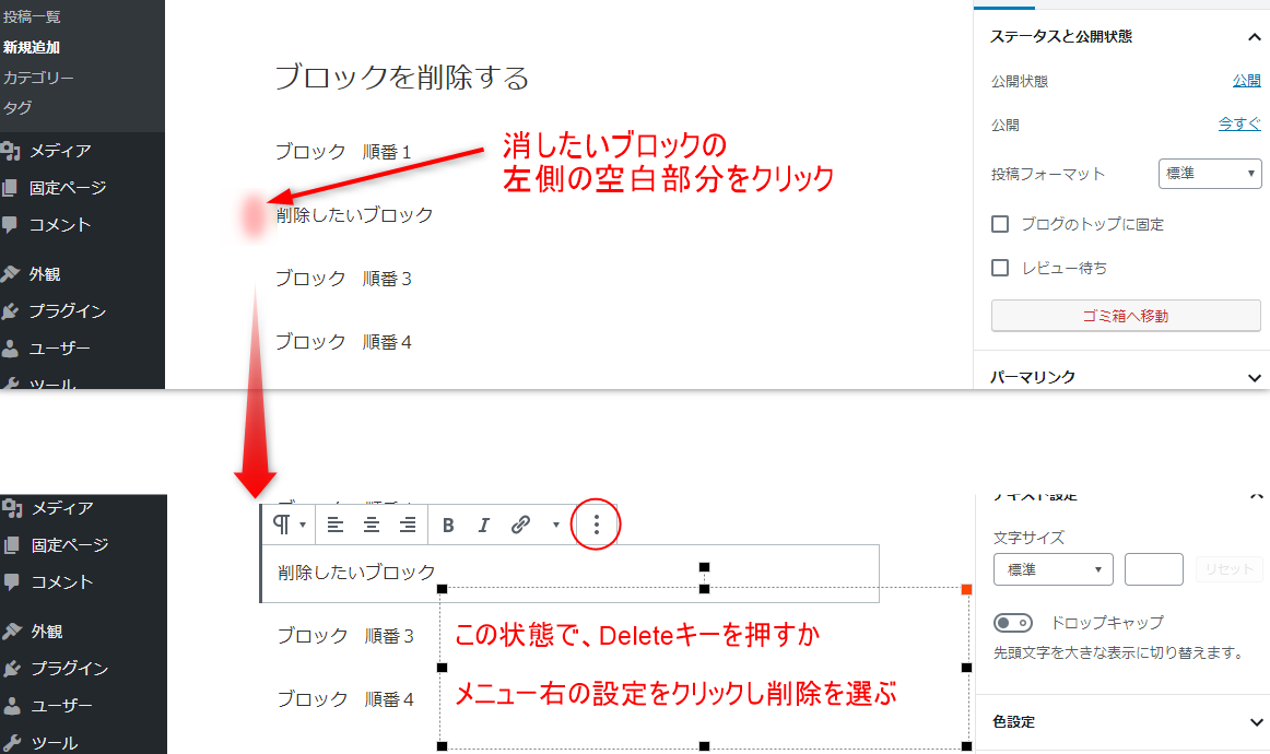 ブロックを削除するには、順序を入れ替えた時のように、削除したいブロックの左の空白部分をクリックします。