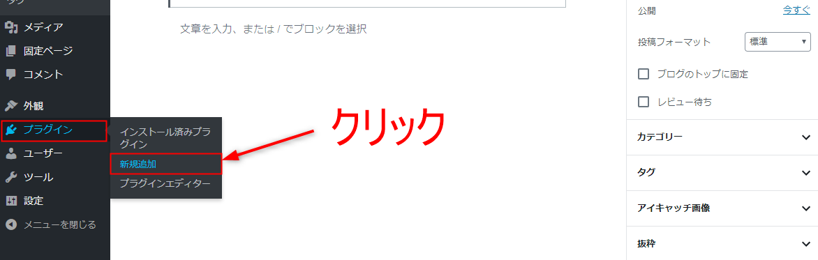 管理画面の「プラグイン」→「新規追加」をクリックして、プラグインの追加画面へ移動してください。