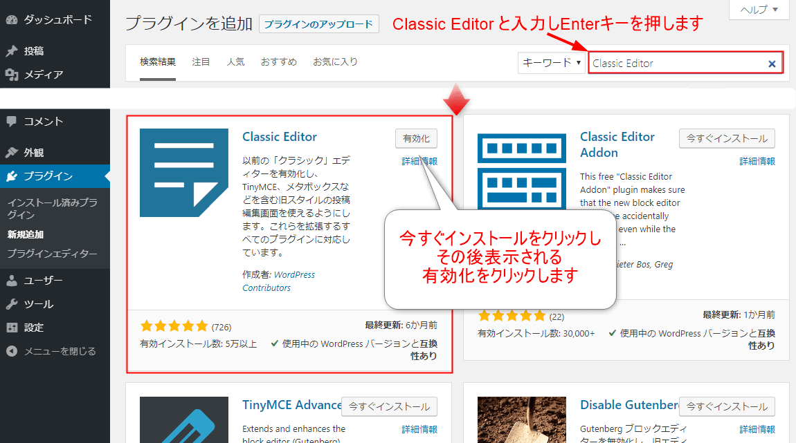 画面上部右側にあるキーワードに「Classic Editor」と入力し、Enterキーを押してください。