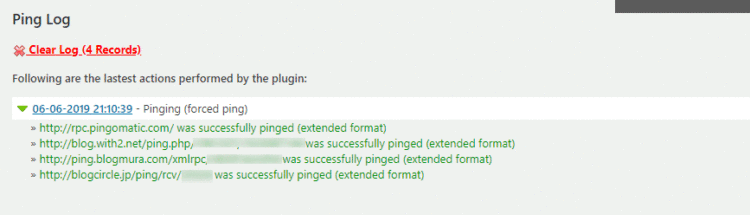 WordPress Ping Optimizerを使うことで、Ping Logが流れ、きちんと送信されていないURLは赤文字でエラー表示されます。
