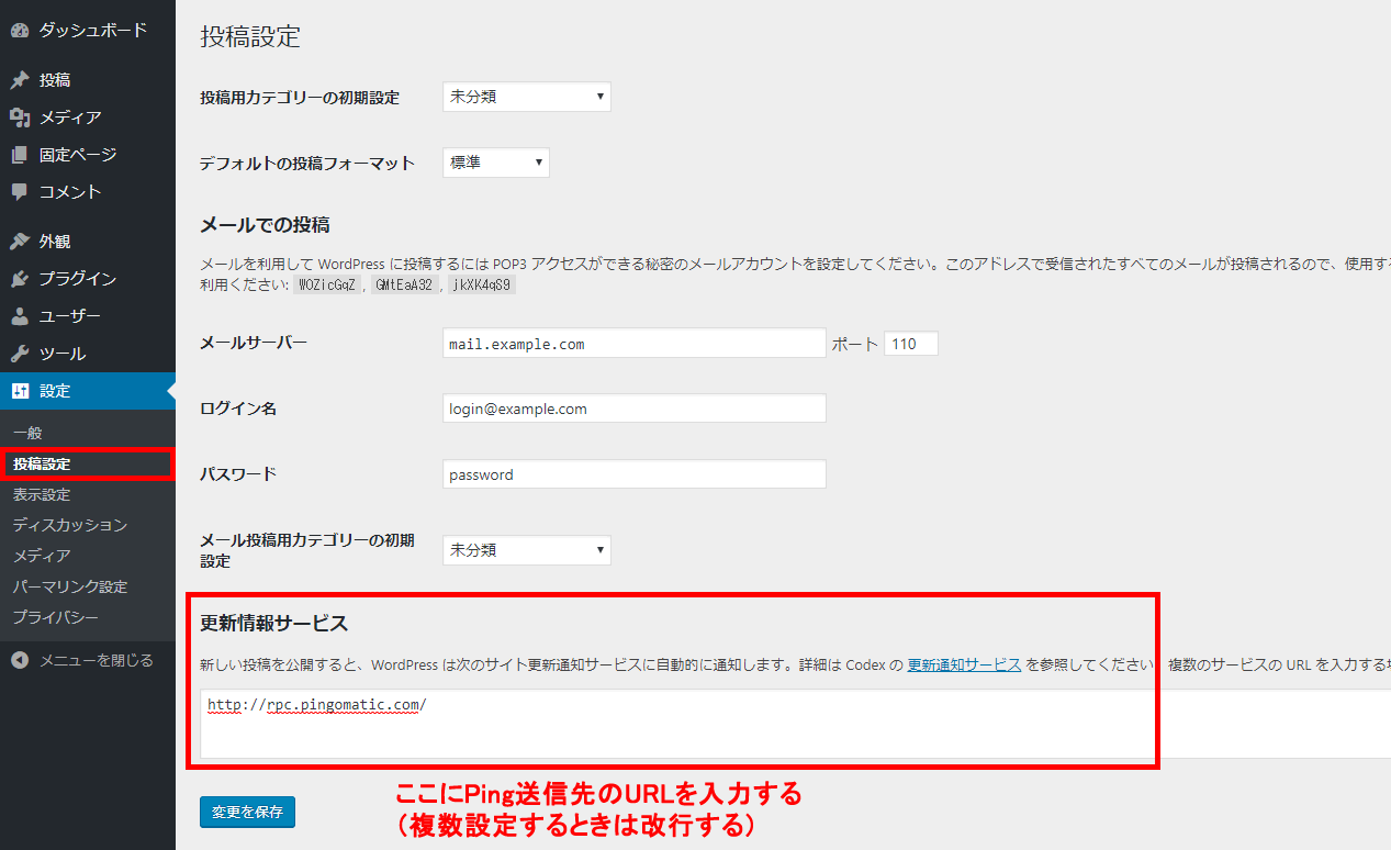まず「設定」を開き、次いで「投稿設定」を表示します。順番に見ていくと更新情報サービスというものが確認できますので、そこに設定したいPing送信先のURLを貼り付けます。