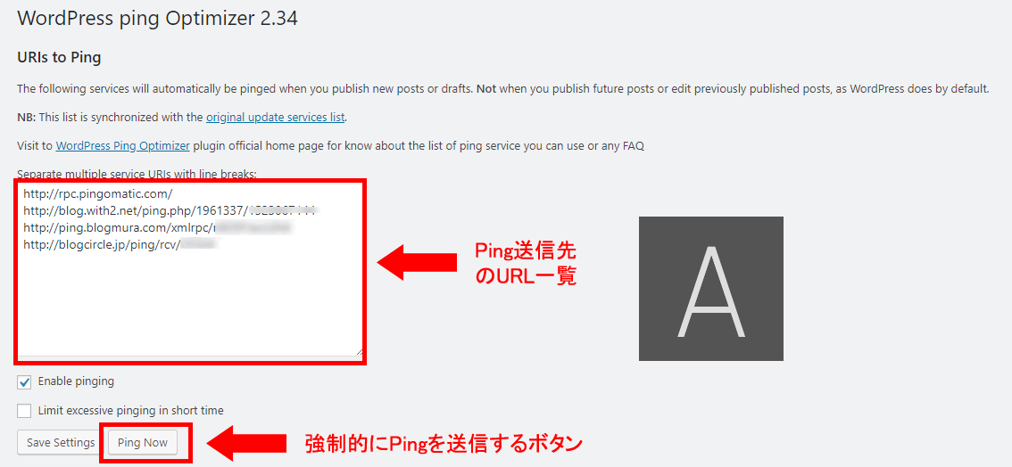 Ping送信先のURL一覧が、表示されています。