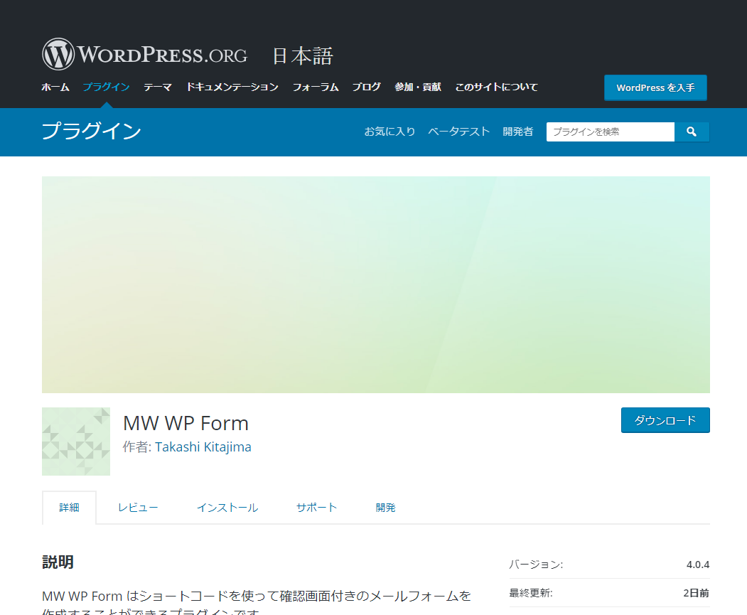 MW WP Formは、管理画面「プラグイン」→「新規追加」で検索して、インストールできます。