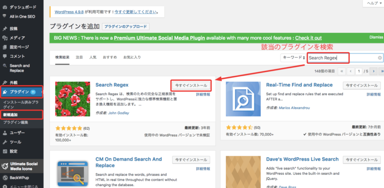 まずはこの「Search Regex」のプラグインについてご紹介致します。