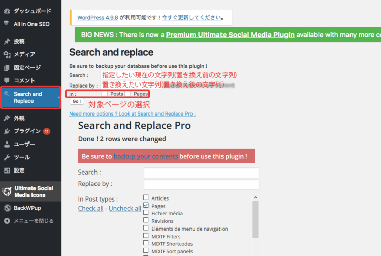 - 文字列の置き換えをするなら、プラグイン「Search Regex」を使用。