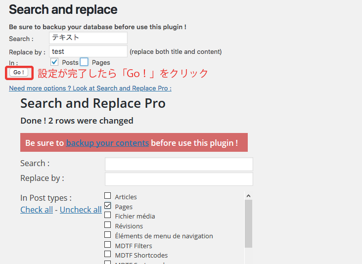 全ての設定が完了したら「Go!」をクリックして置き換えを実行します。「Search Regex」と違い、プレビュー画面などは表示されないので、慎重に操作してください。