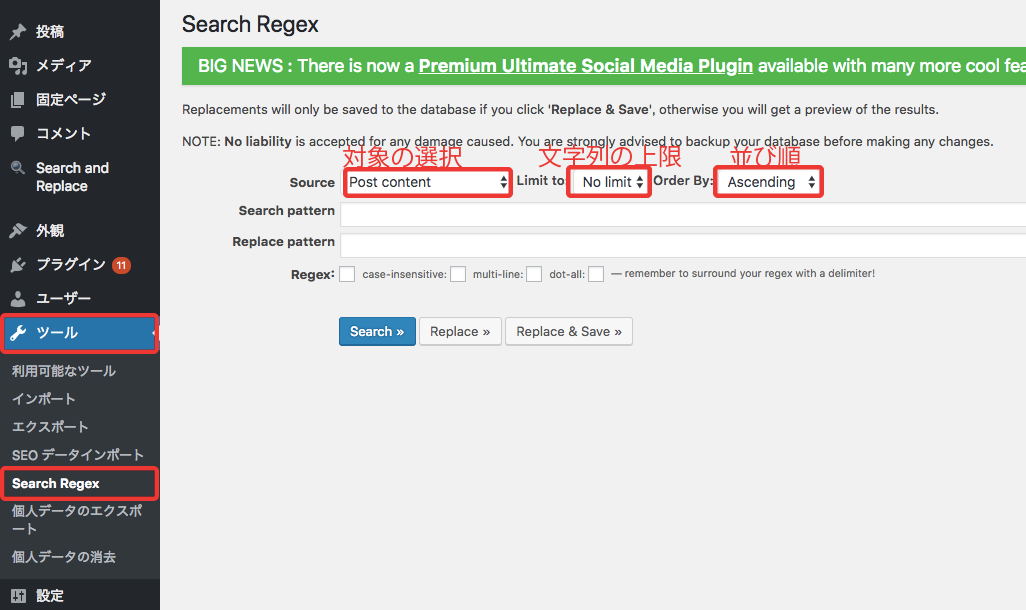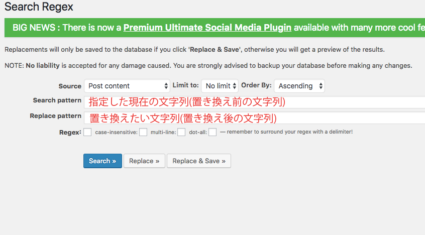 文字列を一括置き換えするプラグインで、一番有名なのが「Search Regex」です。文字列の一括置き換えなどではよく使われています。