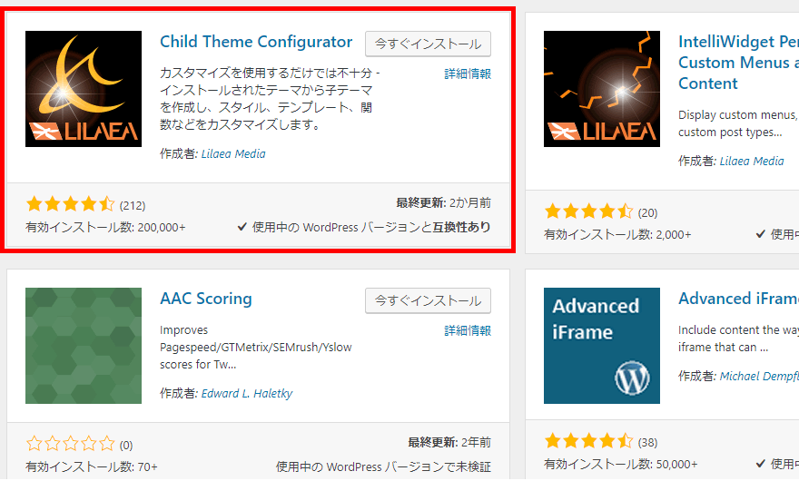 まずは、「Child Theme Configurator」をWordPressにインストールして有効化しましょう。このプラグインは、管理画面で検索してインストールできる公式のプラグインです。