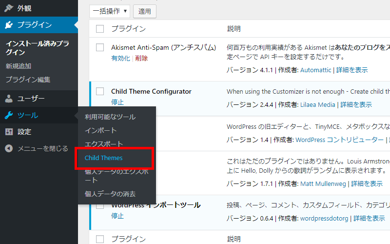 インストールして有効化を終えたら、プラグインの設定を行います。「ツール」→「Child Themes」のメニューからプラグインの設定ができます。