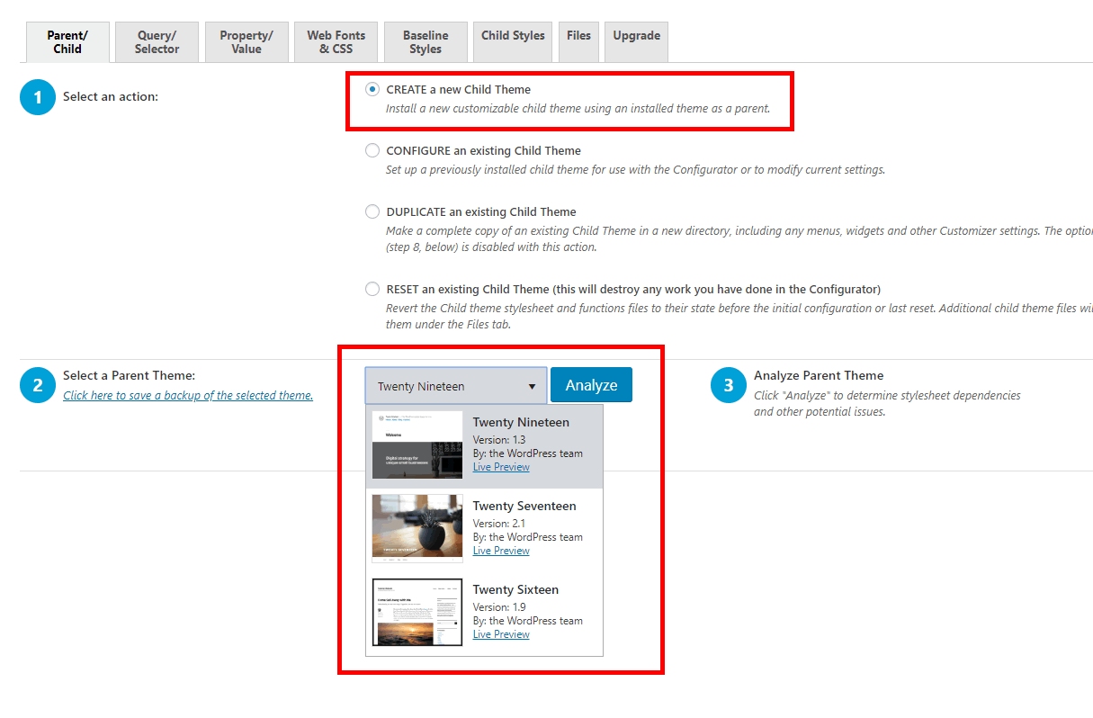 ドロップダウンメニューがあり、その中にWordPressにインストールされているテーマの一覧が表示されています。親テーマにしたいテーマを選択して、「Analyze」ボタンをクリックします。