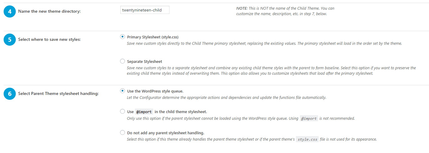 「5. Select where to save new styles」には、子テーマ用のスタイルシートの保存方法を指定します。「Primary Stylesheet (style.css)」のままでOKです。