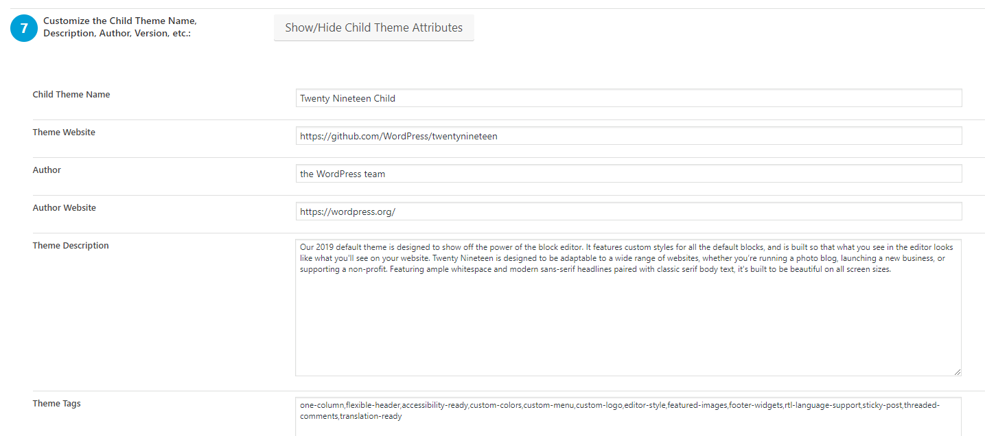 「7. Customize the Child Theme Name, Description, Author, Version, etc.」では、子テーマの情報を設定します。