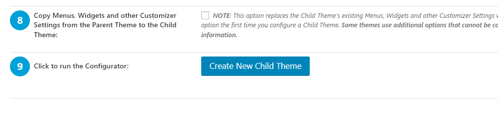 「9.Click to run the Configurator」最後に「Create New Child Theme」ボタンをクリックすると、子テーマが作成されます。