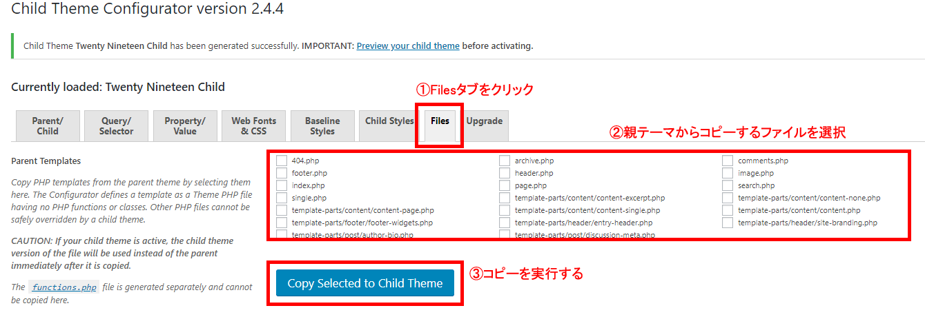 一覧から子テーマにコピーしたいファイルを選択して「Copy Selected to Child Theme」ボタンをクリックすると、子テーマのフォルダへとファイルがコピーされます。